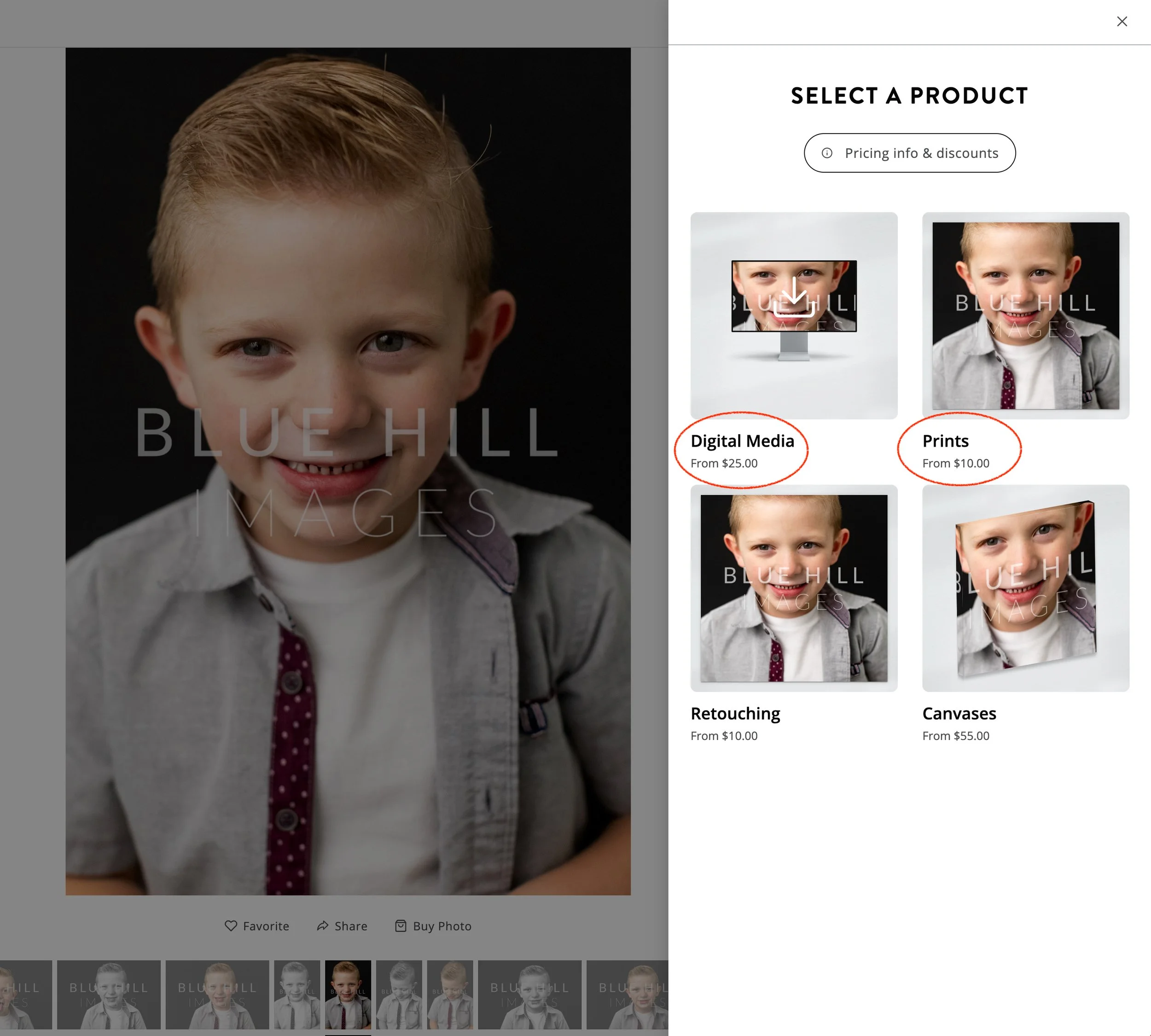 Prints and digital portraits are available for purchase directly in this online gallery. Just click on any photo to view it and access an option to buy it by clicking the "Buy Photo" button in the top right corner. You will be then be given options for Digital Media, Prints, Canvases, or Retouching. You can order ALL the digital files in the album by selecting ANY photo in the gallery and choosing the “All Photos in Album” option. See screenshots below to see where you can find all the options.